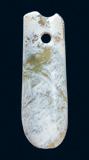 灰白色, 局部呈绿色。器体呈长条状, 顶端略凹, 两侧竖直, 一面外弧。另一面内凹, 末端呈圆弧状外凸, 近顶端中部自单面钻一小圆孔。