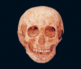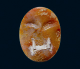 黄褐色, 叶腊石质。平面呈椭圆形, 表面磨光, 厚薄不均。正面偏上有两道弯弧形的凹槽, 代表双目。下侧偏中磨出一道横向凹槽, 内嵌长条形蚌壳, 左右两侧各有两道上下对称的浅凹槽, 分别嵌入三角形蚌壳, 代表嘴及牙齿。