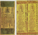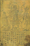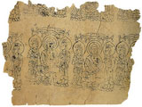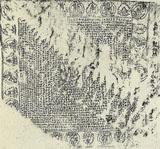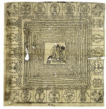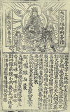 此图印于茧纸上,正中菩萨八臂执法器坐于莲座上,四周绕刻梵文经咒,外栏间刻菩萨像及供品