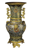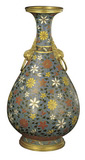 镀金,以浅蓝、深蓝色釉为地,掐丝填彩釉为纹,附两铜镀金象鼻耳,颈部饰各色菊花十二朵,腹部饰三色番莲六朵,近足处饰一周莲瓣纹