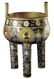 镀金,仿青铜鼎,腹上部饰镀金弦纹一周,纹上以墨绿为地饰折枝菊花、白花十二朵;纹下以浅蓝为地饰番莲六朵;三足饰缠枝梅、菊等纹饰