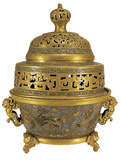 镀金,镂空夔凤捧寿双层盖,透雕龙纹纽。炉身以浅蓝釉为地,掐丝珐琅双狮纹图案。肩部附两圆雕兽耳,三象首为足。底心凹进长方框内有“大明景泰年制”楷书款