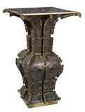 镀金,以浅蓝釉为地,通体饰各色掐丝云纹及缠枝花草。方口、直颈、倒犁形腹、方形圈足,尊身四面出八戗脊,呈镂空夔纹形状。