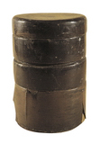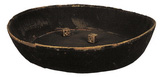 由窄木条圈叠成型,贴以粗麻布。通体髹黑漆。口沿有金属扣的痕迹。外底朱书“庚午岁李上牢”六字款。此器为双陆的骰盆,供博戏时掷骰之用