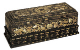 木胎,盝顶长方形,下为须弥座。通体髹黑漆,嵌彩色厚螺钿片。盖面饰团花纹,中嵌水晶和彩色宝石。须弥座凹形壸门内有堆漆描金瑞草