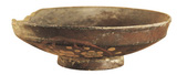 木胎。器直口,折腹内收,小平底,圈足。通体髹褐漆,并绘团花三组。一组为盛开的白梅,间以花蕾;一组为三只黄蝶;一组为一丛翠竹