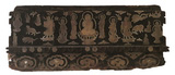木胎,盝顶长方形,函身连座。通体髹黑漆,嵌乳白色贝片。盖面嵌三朵宝相团花,中镶绿色玻璃;邦板则饰飞仙图;立墙嵌说法图;两侧横档立墙饰坐佛图。须弥座上以贝片饰壸门。函外底部有四十七字的朱书