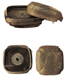 木胎,呈“亚”字形,由盖和底两部分组成。盖顶边缘镶银扣,面上覆一整体镂雕花卉图案的银片。盖内侧有朱书两行。盒底正中嵌铜质团花纹片,其左侧亦朱书两行。盒底圈足镶两道银扣