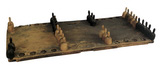 由一片长方形“双陆”板与三十粒黑、白双陆子组成。双陆板为木胎,髹黑漆地,相对的两个长边各以白色骨片嵌制十二个圆形“梁”标,并于中间刻一月牙形“门”的标志。双陆子皆平底,束腰尖顶,形制规整