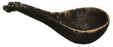木胎。勺头似半桃形,圜底。柄端雕作龙首状。通体髹酱红色漆