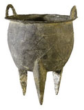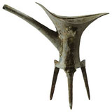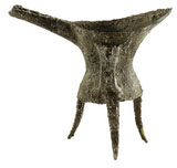 一个流、尾均较长且深,流与口间两侧各铸三角钉短柱一个,下接三个外侈的锥足