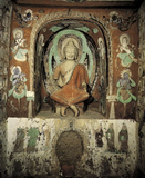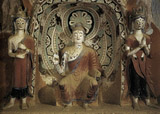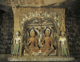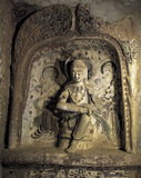 主尊佛倚坐龛中,两身供养菩萨恭立龛外两侧