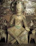 菩萨戴冠,长发披肩,戴项圈、臂钏,身绕帔帛,挂长璎珞,下束裙,裙轻薄贴体