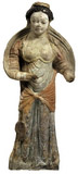 女子露乳,肩披帔帛,身穿长裙,腰部红巾