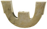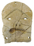 用陶片切割制成。镂刻双眼。上部和下部共有五个穿孔,用于穿绳佩带
