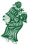 此幅剪纸表现一妇女纺织时一手摇纺车,一手拿棉絮的动态,纺车、人物衣纹及脸部均用阳纹表现。