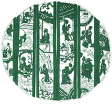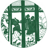 此窗花用老红纸剪成,人物全用阴纹表现,面部都是“满脸”。画面情节据说是山东五音戏中已经失传的剧目磨底镜