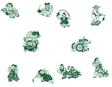 儿童形象生动活泼,有的钓鱼,有的拉车,有的玩猫,有的斗蛐蛐,有的点爆竹。